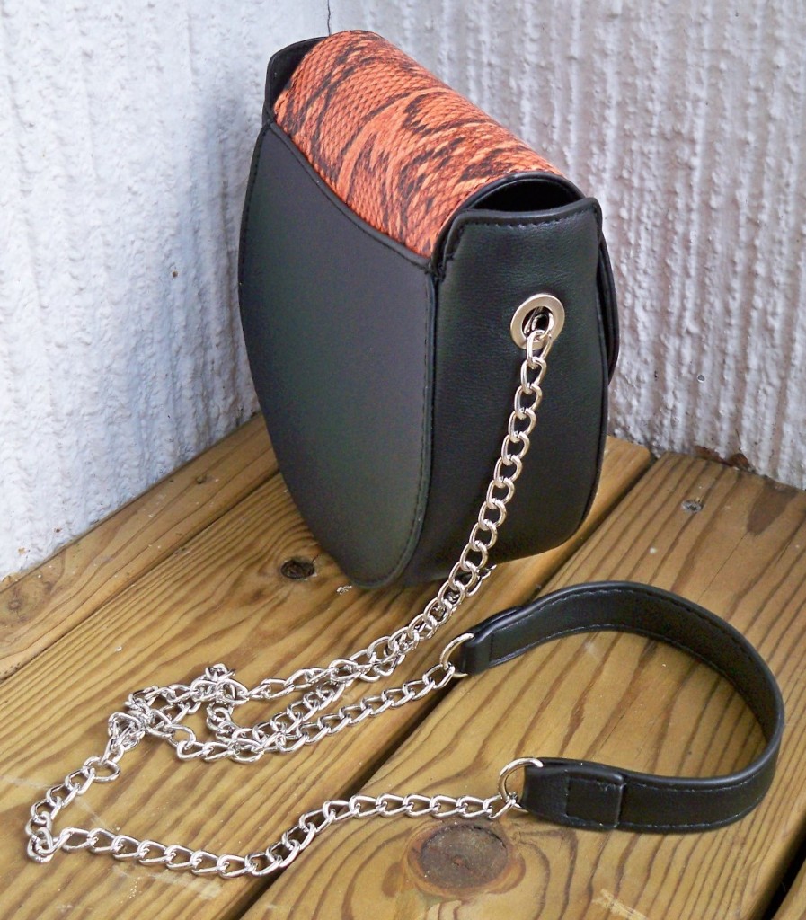 Svart väska med orange ormskinnsmönstrat lock