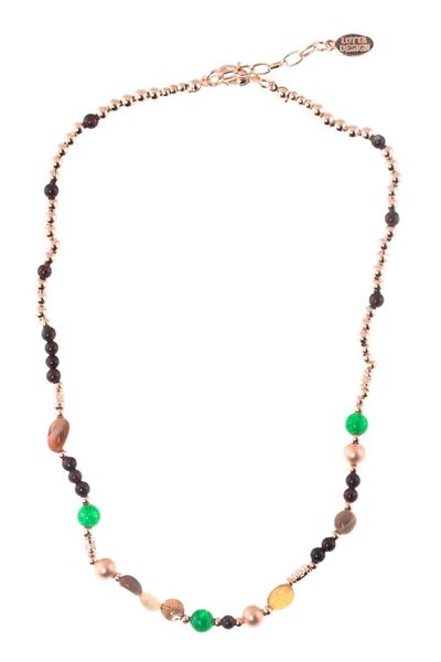 Fint halsband med gröna, gråbeige och rödbruna halvädelstenar samt guldfärgade små pärlor