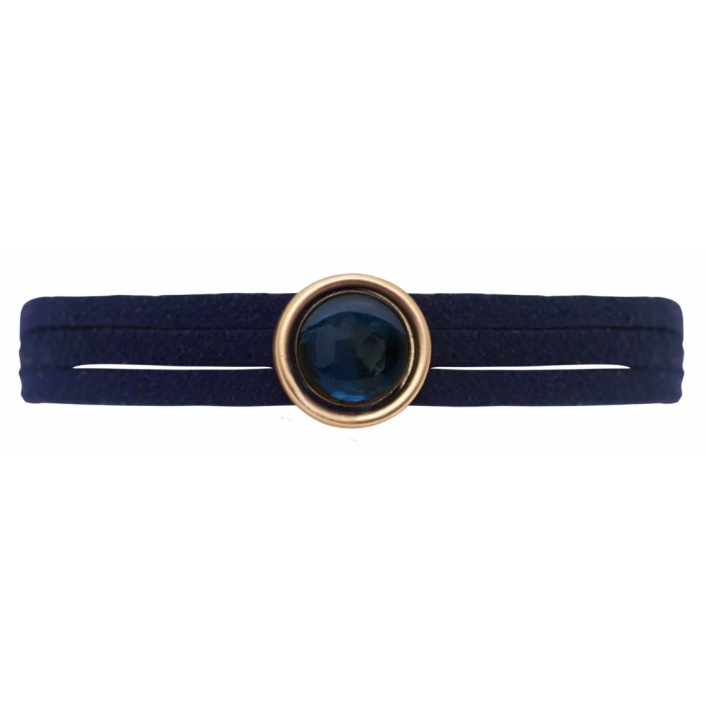 Mörkblå mocka, matt 14 karat guldplätering och en blå resinsten, diameter 12 mm