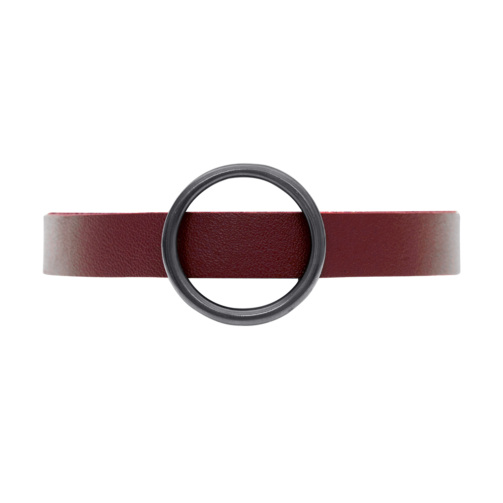 Vinrött mjukt och smidigt läder med hematitpläterad ring ca 2,5 cm i diameter
