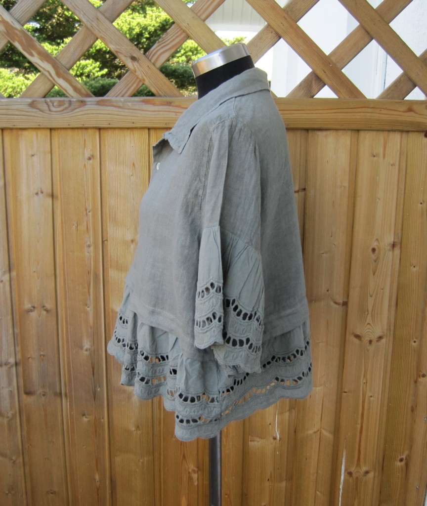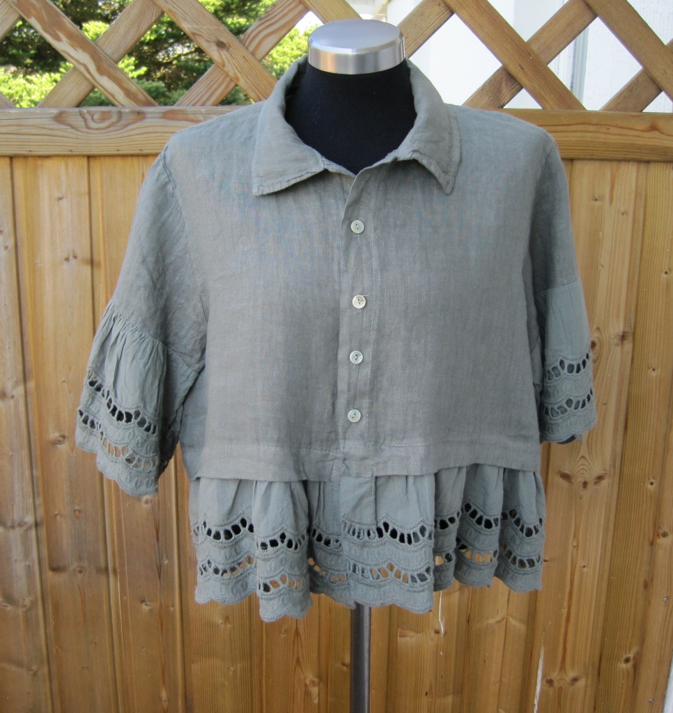 Linneblus i mjuk kvalitet med krage och volanger med brodyr och hålmönster av mjuk bomull