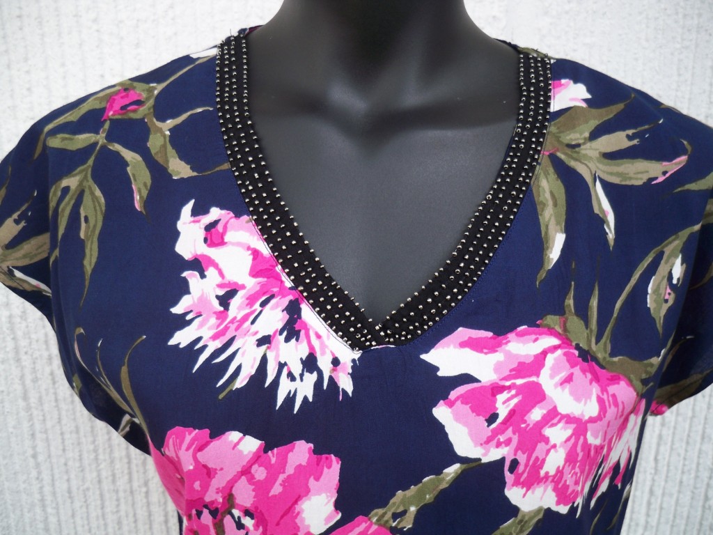 Svart band runt v-ringningen med små fastsydda pärlor